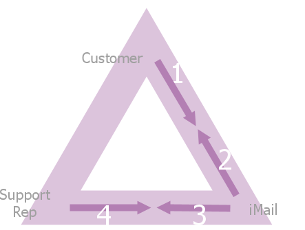 1. A customer asks a question. The email, either a direct message or a re-routed message from an online support page, is sent to iMail.